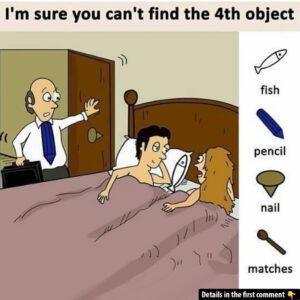 At first glance, this scene looks like a husband stumbling on a betrayal—but beneath the drama lie four cleverly disguised objects: a fish, a pencil, a nail,…