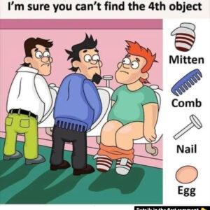 Test your attention to detail with this cheeky restroom scene: three men at the urinals conceal four everyday objects in plain sight—a comb, a nail, a mitten,…