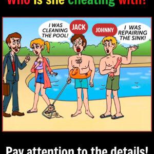 Ready for a quick detective challenge? In this poolside scenario, a furious husband bursts in, accusing his wife of cheating. Two men offer alibis: one claims to…