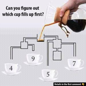 Can you figure out which cup will be filled first? Take a close look at the puzzle and follow the path of the coffee – it’s not…